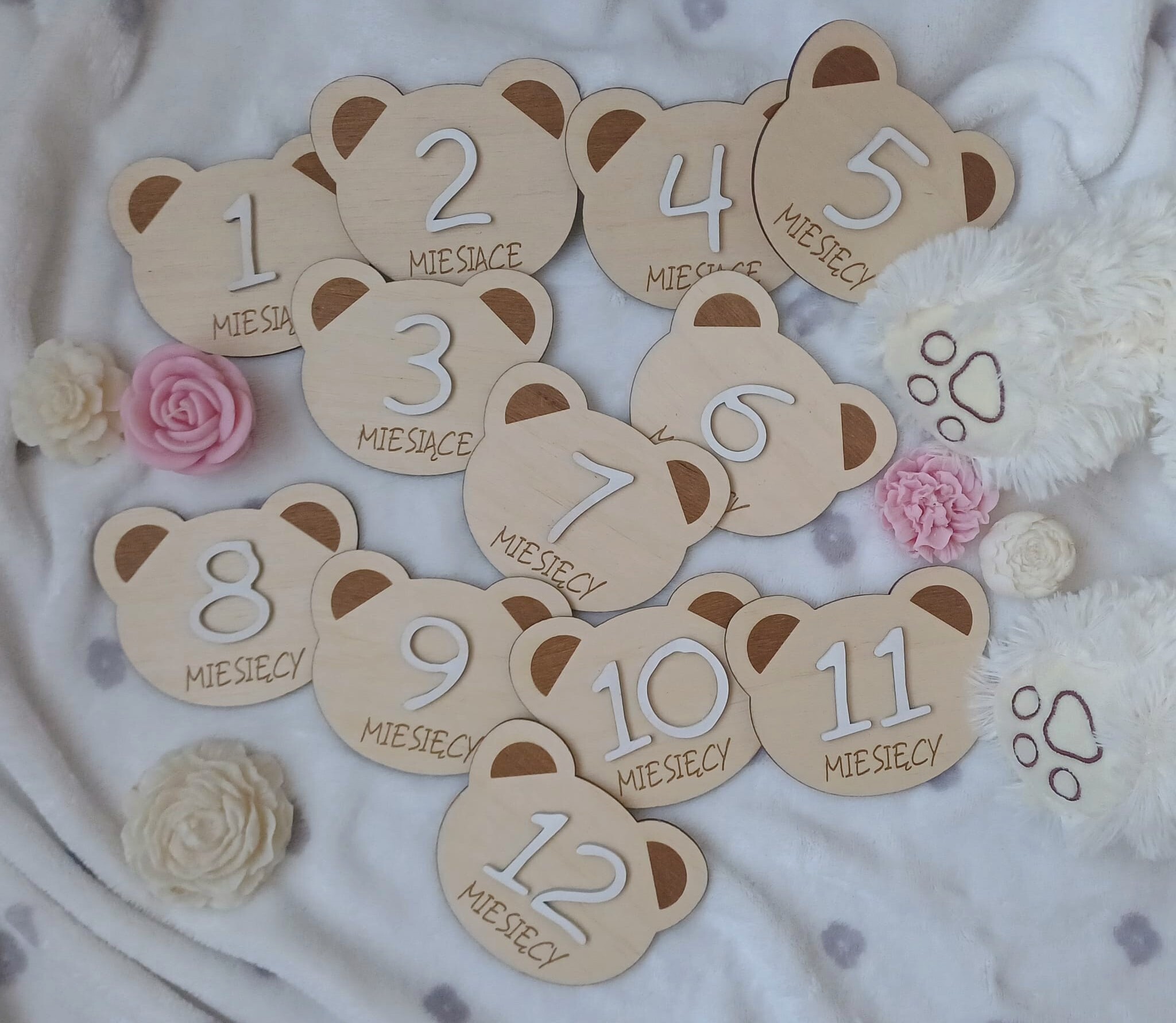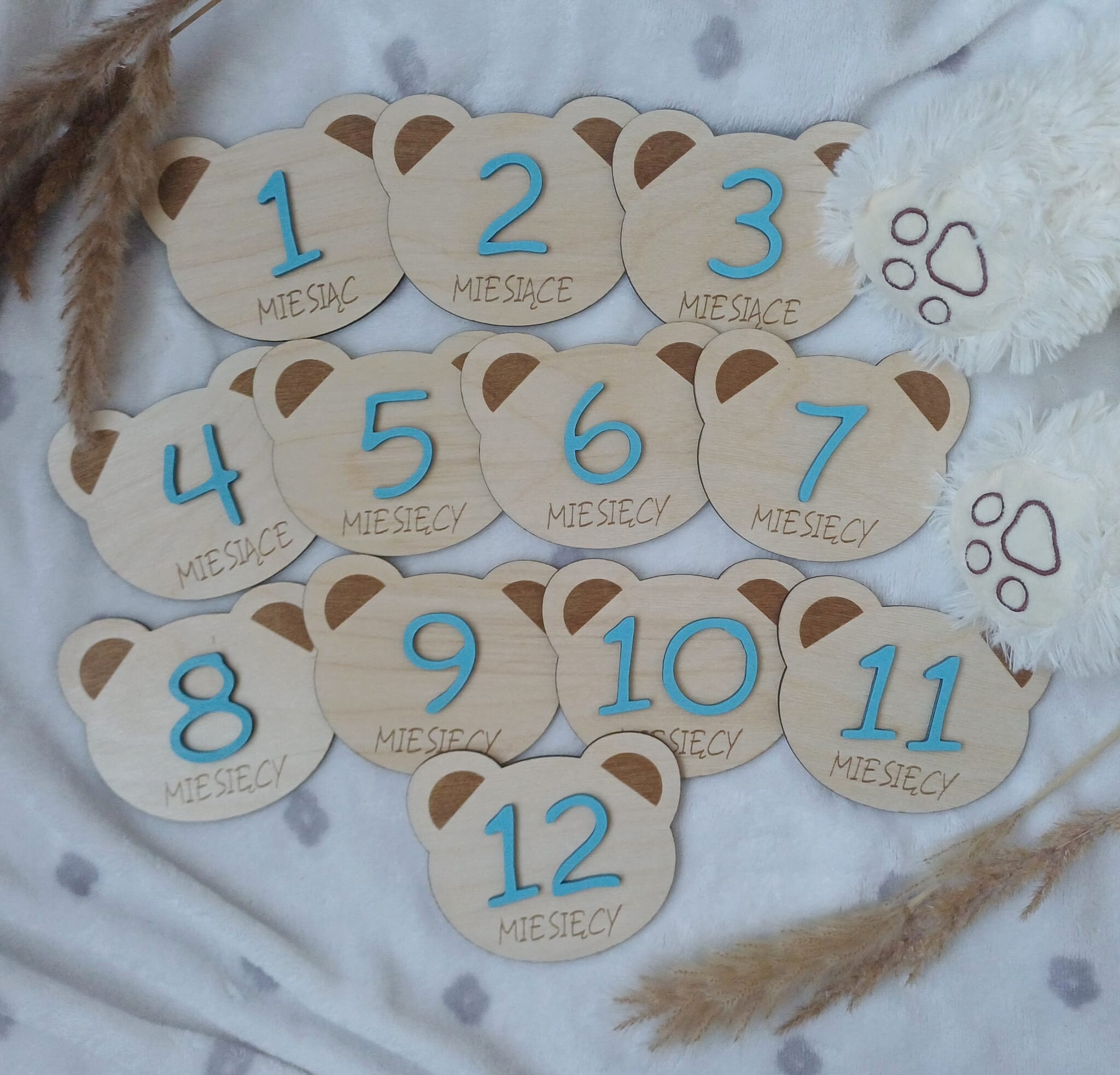 Tabliczki drewniane do zdjęć w kształcie misiów to idealny sposób na uchwycenie najważniejszych momentów w pierwszym roku życia Twojego dziecka. W zestawie otrzymujesz komplet 12 tabliczek oznaczających kolejne miesiące – od 1 do 12.
