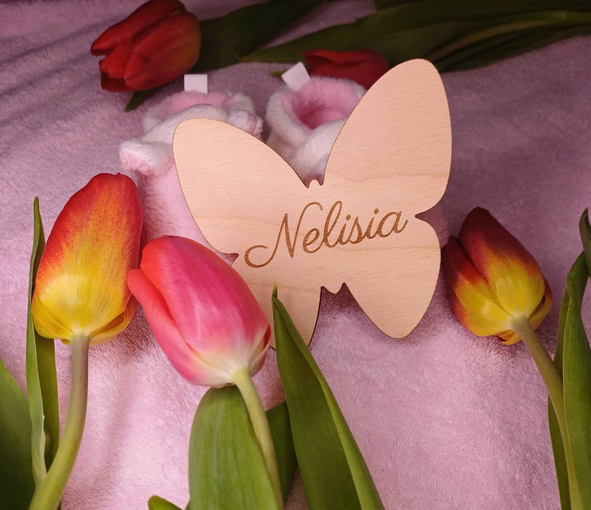 Skomponuj dowolną liczbę pamiątkowych tabliczek z wybranym przez siebie tekstem, wykonanych w kształcie motylka. Taka spersonalizowana tabliczka doskonale sprawdzi się jako prezent dla rodziców spodziewających się dziecka, dodatek do sesji ciążowych lub sposób na upamiętnienie ważnych chwil i kroków milowych w życiu maluszka. Propozycje napisów: